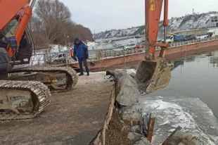Подрядная организация приступила к разборке поврежденных конструкций берегового устоя моста через Оку, остановленного из-за ледохода.