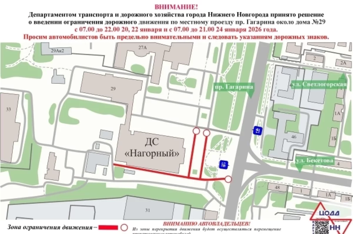 В связи с проведением спортивных мероприятий в Нижнем Новгороде, 20 и 22 января с 7:00 до 22:00, а также 24 января с 7:00 до 21:00, будет временно закрыт для проезда участок местного проезда проспекта Гагарина в районе дома №29. Об этом сообщили в ЦОДД по Нижегородской области.