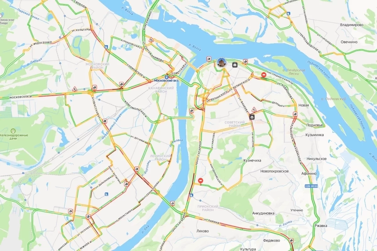 В верхней части города движение практически парализовано на площадях Сенной и Лядова, улицах Ванеева, Белинского, Минина и Большой Печерской. Заторы наблюдаются на проспекте Гагарина, Анкудиновском шоссе и Лысогорской улице. В нижней части наиболее сложная ситуация сложилась в районе Сормовского поворота, на улицах Коминтерна, Кузбасской, Героя Попова и Новикова-Прибоя. Остановлено движение на Комсомольском шоссе и Мызинском мосту.
