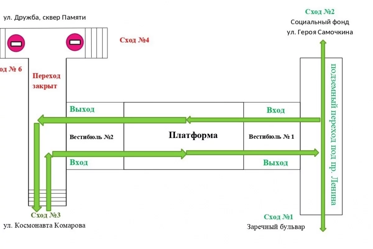 При этом подземный переход под проспектом Ленина со стороны вестибюля №2, расположенный между улицей Космонавта Комарова и улицей Дружбы, останется пока закрытым. Это связано с тем, что на сходах №4 и №6 продолжаются ремонтные работы.