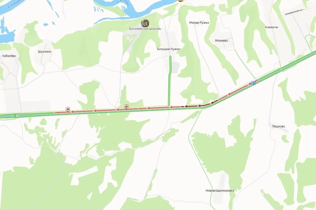 Массовая авария с участием более десяти автомобилей произошла на федеральной трассе М-7 в районе Гороховца. Об этом свидетельствуют данные сервиса «Яндекс Карты».