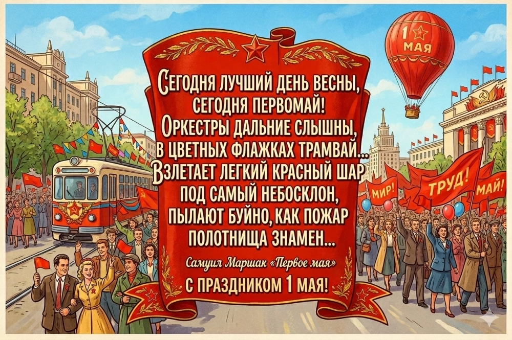 Как здорово было в погожий денёк шагать всем вместе, махать флажками, шариками, нести на плечах радостных малышей! А потом – песни, порой даже танцы под гармонь. Многие вспоминают 1 Мая очень тепло. И, конечно, люди с детства знают стихи ко Дню международной солидарности трудящихся.