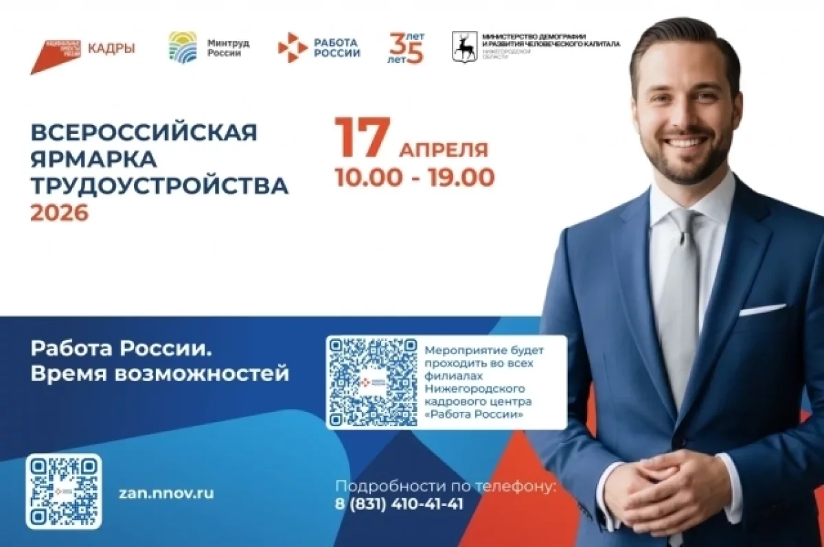 17 апреля 2026 года в Нижегородском регионе пройдет региональный этап масштабной ярмарки вакансий «Время возможностей», организованной в рамках проекта «Работа России». Об этом сообщили в правительстве Нижегородской области.