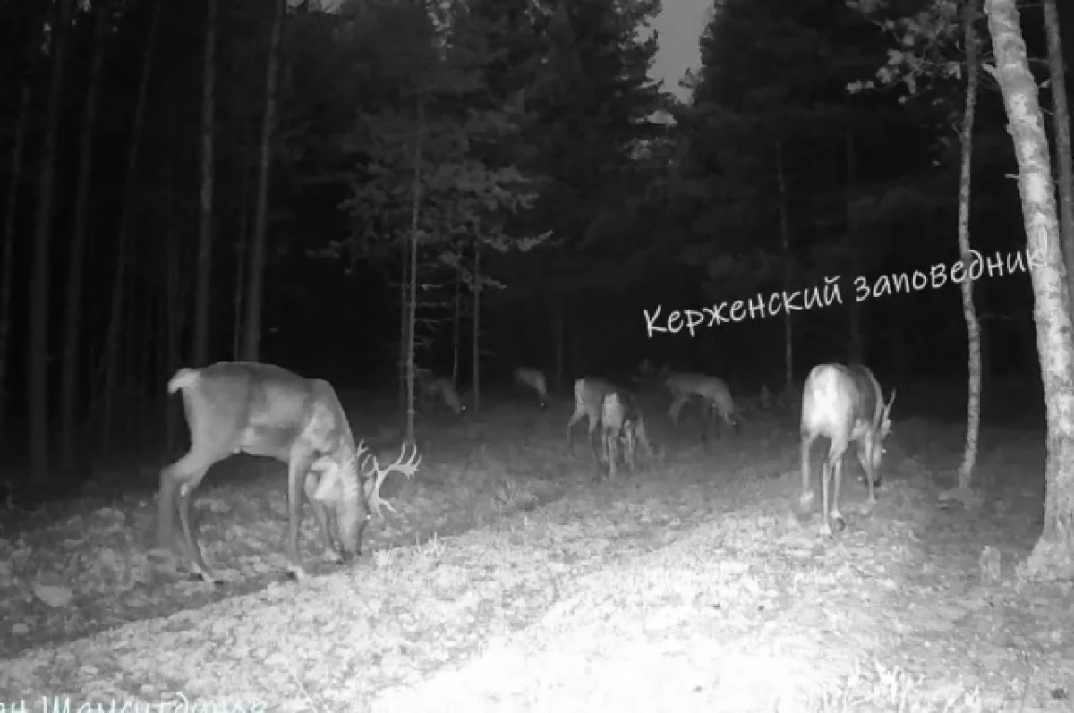 Стадо оленей попало в кадр фотоловушки во время ночной съемки в Керженском заповеднике.
