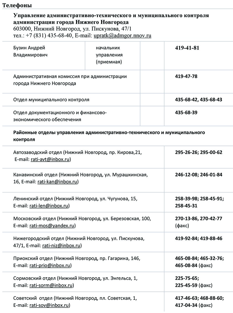 Отделы городского управления работают в каждом районе Нижнего Новгорода, их телефоны и электронные адреса — в таблице ниже.
